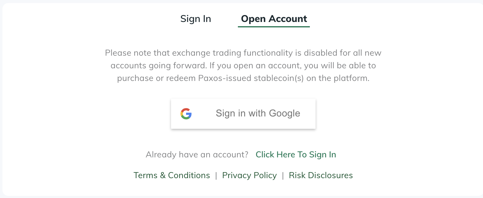Please note that exchange trading functionality is disabled for all new accounts going forward. If you open an account, you will only be able to purchase or redeem Paxos-issued stablecoin(s) on the platform.