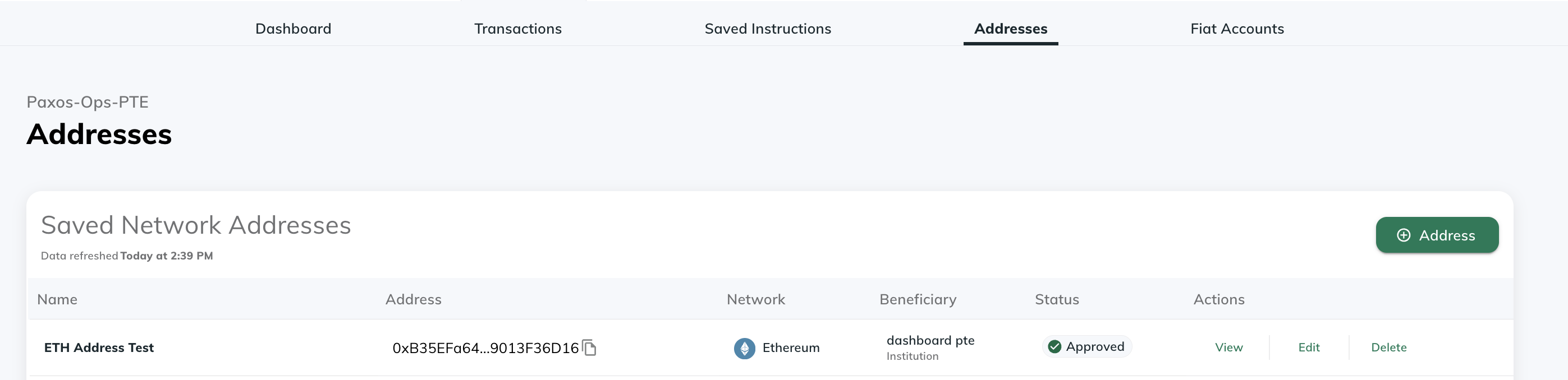 Within the “Addresses” tab, you can View / Add / Delete / Edit your saved wallet addresses. Note that these features will only be available to users with the "Treasurer" role