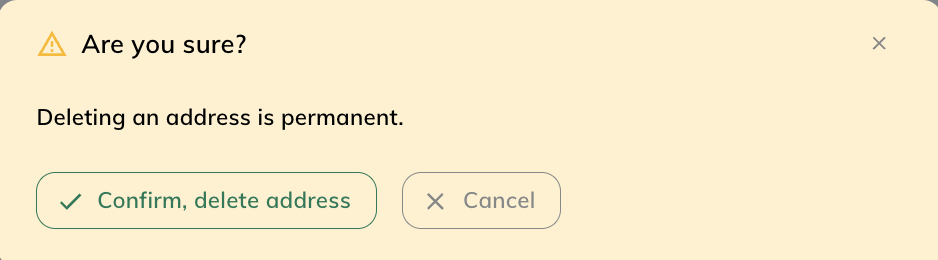Clicking on the "Delete" button will open a pop up that will ask for confirmation to delete the saved address