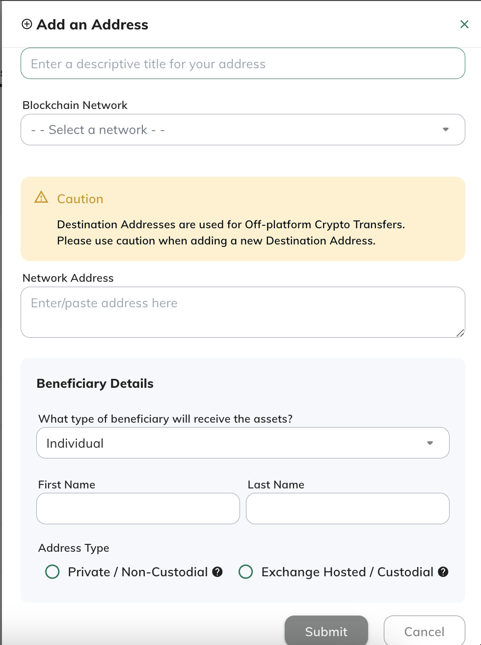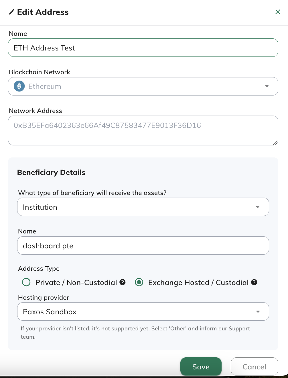 Clicking on the "Edit" button will open a pop up that will display information about the saved address. Here, you will be able to update the nickname as well as Beneficiary details of the saved address. Please note that the network address cannot be edited - you would have to delete the original address and then add a new address.