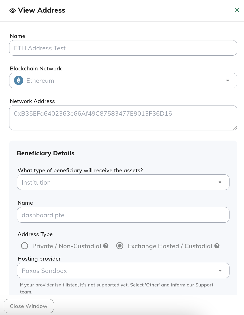 Clicking on the "View" button will open a pop up that will display information about the saved address.